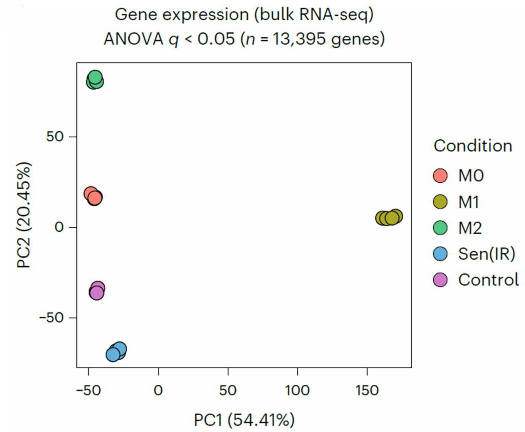 They didn’t. Across RNA sequencing, proteomics, and metabolomics, the senescent macrophages formed their own distinct group. Not a subtype of activation, but a separate state altogether.