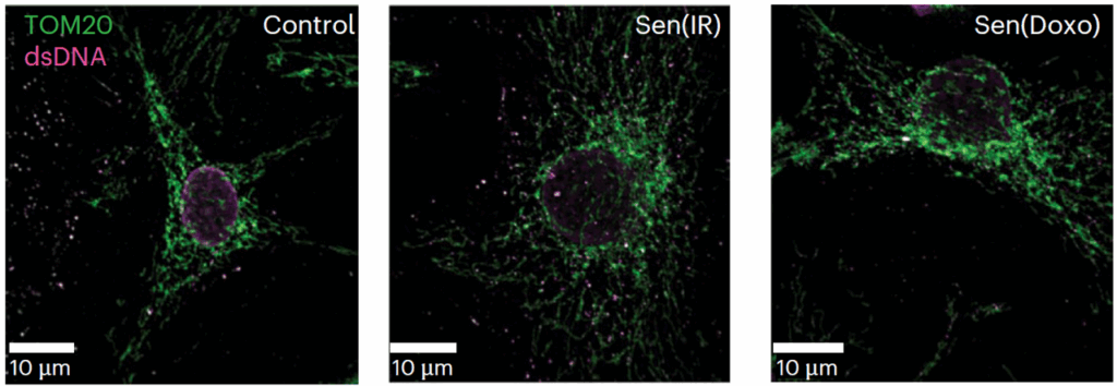 Fluorescence images showing the location of mitochondria (green: TOM20) and DNA (magenta: dsDNA) in macrophages under different conditions. In control cells, DNA is mostly contained within the nucleus, while mitochondria form an organized network around it. In senescent cells induced by irradiation (Sen(IR)) or doxorubicin (Sen(Doxo)), small fragments of DNA can be seen outside the nucleus and overlapping with or dispersed among the mitochondrial network. This suggests that mitochondrial DNA is leaking into the cell, which can trigger chronic inflammatory signaling associated with aging.
